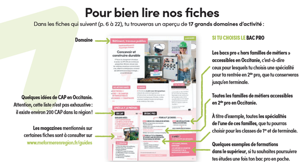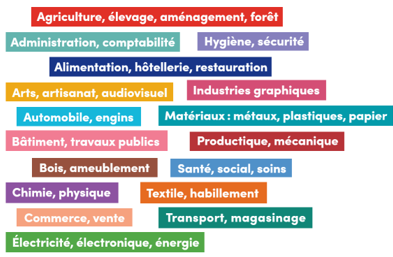 Si la voir pro désigne un parcours scolaire orienté vers la découverte d’un métier, quel que soit le domaine, et l’insertion rapide dans le monde du travail, elle permet aussi de poursuivre ses études. Dans ce guide vous trouverez les formations de la voie pro classées par 17 Grands domaines, reconnaissables par un code couleur ! Guide sur la voie pro 2026, édité par la Région Occitanie.